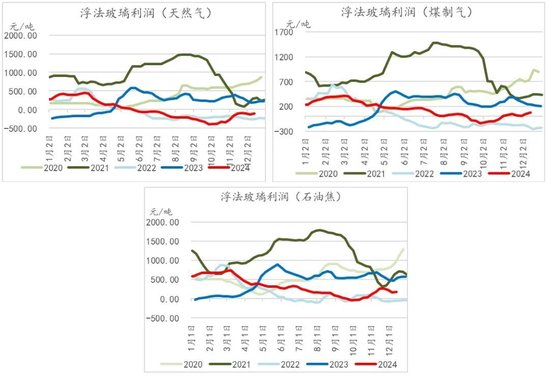 2024年浮法玻璃行业整体利润均处于一个下滑趋势之中,并且在今年三季度后期,浮法玻璃经历了全行业亏损的至暗时刻。9月底,天然气工艺亏损程度最高达-400.44元/吨,煤制气工艺亏损程度最高达-135.15元/吨,石油焦工艺最大亏损达37.58元/吨。后续随着价格的企稳反弹,利润得到一定程度修复:截至到12月13日,三大生产工艺中,仅天然气工艺维持亏损:-105.92元/吨,煤制气工艺为78.71元/吨,石油焦利润为171.22元/吨。