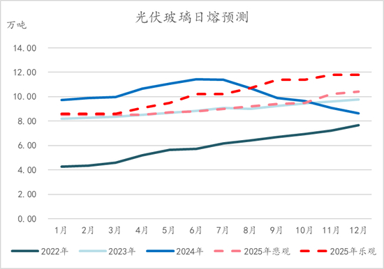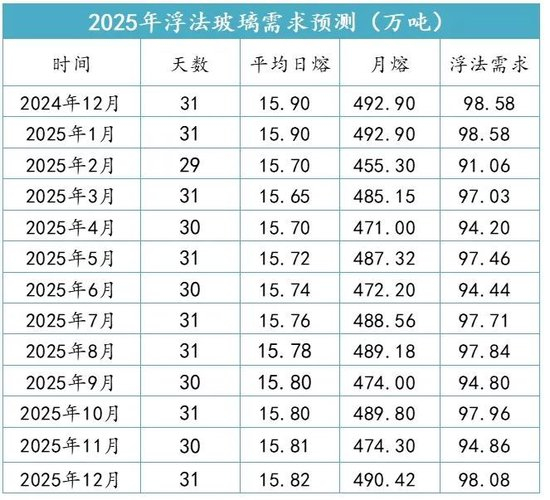 对于2025年浮法玻璃产量方面,预计全年产量大致在5770.13万吨左右,较2024年全年下滑6.42%左右。日熔方面,全年平均日熔大致15.78万吨,趋势上预计整体呈现全年缓慢上升趋势(见下图)。