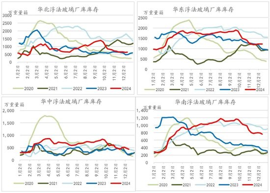 今年以来,因需求端未能承接高供应情形,浮法玻璃在四季度之前均维持着累库的格局,尤其一季度的季节性淡季、节后复工晚的情形下,累库速度相对较快。此后二三季度虽累库速度较一季度放缓,但整体厂库库存水平较去年同期而言有着不小的压力。自三季度末开始,厂库库存才逐步转为去库格局。截至12月13日,全国浮法玻璃厂库库存共计4762.50万重量箱,相比于今年年初1月12日的3060.40万重量箱,共计累库了1702.1万重量箱,库存环比增加了55.6%。分地区来看,沙河地区基本无库存压力,且厂库同比低于去年同期,目前仅主销区——华南地区因价格劣势,而导致库存压力相对较大,西南次之。此外当前其他地区库存压力均处于可控状态。