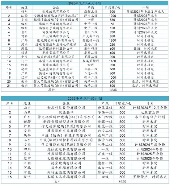 自24年11月起,浮法玻璃产线冷修进度整体大幅放缓,从已知产线计划来看,明年浮法玻璃产线仍有一定冷修计划,但整体放水冷修的空间相对今年会较为有限。此外若浮法玻璃价格后续逐渐好转、企业利润恢复,预计玻璃厂复产产线将陆续增加。通常来讲,浮法玻璃产线冷修后重新生产大约需要6个月左右(之前也有大厂最快4个月完成重新生产),主要影响该周期的因素在于资金、材料准备、人员配置等。当前已知明年产线计划如下图:
