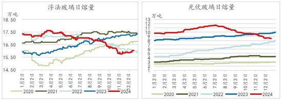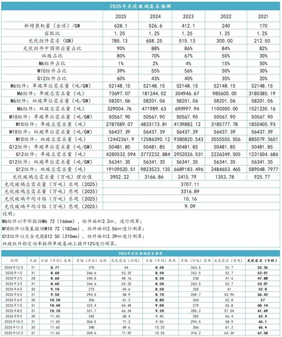 光伏玻璃方面,虽2024年整体光伏组件效益较差,但从明年光伏新装机量上来看,全球新增光伏装机增速预期或在15%-20%左右,中国预计同比增速0-2%左右,海外市场增速有望达到30%-40%。从国际市场角度来看,2024年非欧美海外市场组件出口增速保持在50%以上,非欧美市场电力缺口大,新能源政策支持较好,中东、印度、巴西及巴基斯坦需求增长较大,因此仍然会是明年光伏新增的重要市场之一;欧洲市场方面(当前中国光伏组件第一大出口地区),2025年预计增速平稳;美国市场受制于贸易壁垒,出口维持低位。中国光伏组件全球占比在86%以上,在全球光伏组件生产中占有非常重要的位置,也是全球最大的光伏组件生产国,对于光伏组件之一的光伏玻璃来讲,明年仍存一定新增需求点。基于以上展望,光伏玻璃需求方面,我们做出以下预测: