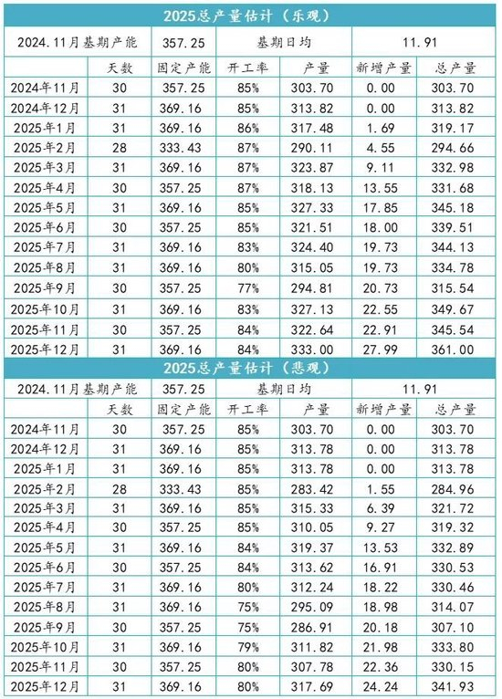 因此,基于以上新增推测,以24年11月作为25年产能推算的基期,按照投产速度乐观、悲观情形,对25年产量情况做以下乐观、悲观两种推测(图表10)。