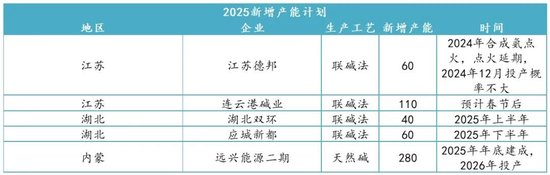 2024年个别产线未能如期投产,计划将延期至2025年。从目前已知新能产能上看,主要包括:江苏德邦:60万吨、连云港碱业:110万吨、湖北双环:40万吨、应城新都:60万吨、远兴能源二期:280万吨。整体新增投产计划及投产进度上,我们大致做出以下推算: