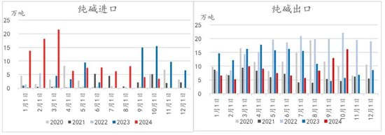 因2023年碱价的高企,外加玻璃厂出于丰富采购渠道的考量,今年一季度仍有大型玻璃厂从海外采购纯碱的情况,因此一季度整体进口量攀升至历史高位,共进口53.46万吨。随着国内价格回落,供应过剩局面的扩大,于四季度再度打开出口优势,从而恢复到净出口格局。10月纯碱出口量达16.17万吨。