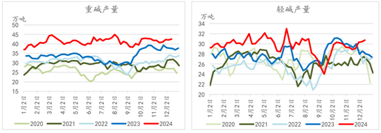 2024年以来,纯碱整体产量维持在历年高位,主要仍是基于2023年以来的大量新增投产。上半年纯碱周度产量最高接近75万吨。三月底起,随着部分碱厂提前检修,使得开工出现一定下滑趋势,直到进入6月提前批检修陆续结束,产量(尤其重质纯碱)及开工率才出现恢复迹象。正因上半年检修的提前兑现,2024年夏季集中检修的产线较往年有一定程度减少,虽在夏季产量仍出现了季节性下滑趋势,但整体产量依旧较高,并且后续随着检修结束,纯碱产量再度回归到检修前的高位区间之中。此外今年因多数氨碱法工艺碱厂逐渐出现亏损,氨碱厂纷纷开始主动减产(尤其是今年四季度),主要以山东海化(300万吨)、山东海天(150万吨,产业单一、亏损较大)、四川和邦等几家大型碱厂为首,此外还包括华南地区(广东)南方碱业此类型生产成本高、并且面临大额环保支出的碱厂。
