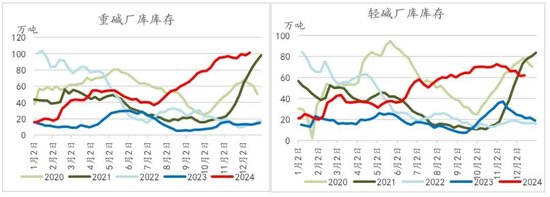 2024年纯碱库存压力是非常大的,整体均出于不断累库的情形。尤其下半年因需求端面临极大的挑战,纯碱累库速度也在不断加快,甚至在所谓检修季期间,累库局面亦没有出现较大的转变。在此情形之下,对于纯碱价格同样也是形成了强大的压制作用。从库存绝对水平来讲,自8月份以来,纯碱厂库库存已经呈现高于历年同期水平的情形。截至到12月13日,纯碱厂库库存已达163.45万吨,较今年年初增长了近342%,其中重碱库存101.37万吨,较年初增长了536%,轻碱库存62.08万吨,较年初增长了195%。此外,截至12月18日,纯碱交割库库存也大幅增加至40.4万吨,较年初增长了近38.5万吨。