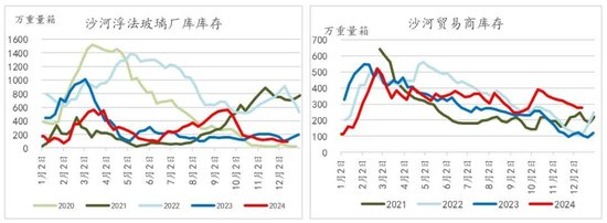 预计春节前加工厂冬储相对有限,后续进入季节性需求淡季,在供应端玻璃生产不间断、深加工企业、地产端工地逐步停工放假的情形之下,25年初玻璃将形成一定累库,在春节前后厂家原片库存压力相对较大一些。但从24年底两个主要产区来看:华北地区(尤其沙河地区)相对库存压力较小,且沙河原片库存量位于历史低位区间;华中地区厂家库存情况也相对可控;这亦为2025年玻璃行情奠定了良好的基础(当前中游期现商库存压力整体大于原片企业)。预计节后在中下游逐步复工后,库存将得到去化,后续进一步关注传统旺季实际需求兑现情况。