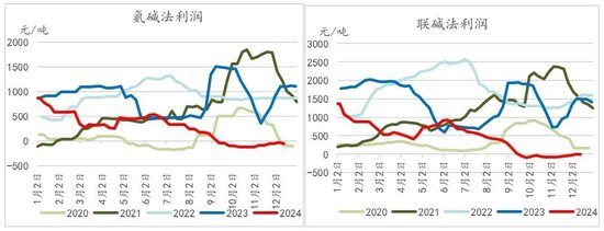 2024年在过剩的大背景下,碱厂利润迎来了持续性的下滑,其中行业内生产成本最高的氨碱法工艺三季度末、四季度起出现了亏损的情形,甚至在此时期,联碱法工艺亦有小幅亏损出现。截至12月13日,氨碱法利润为-52.44元/吨,今年最大利润亏损达-116.5元/吨;联碱法工艺为-4.9元/吨,今年最大利润亏损为-95.4元/吨。
