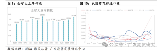 2024年全球大豆供需继续趋于宽松,但其他油籽类均呈现减产迹象。根据USDA数据显示,24/25年度全球大豆产量预计将达到4.25亿吨,同比增长7.6%。2020年以来的高利润格局刺激全球大豆供应快速恢复,但需求放缓,供大于需结构持续强化,全球大豆库销比已回升至高位区间。美国大豆盘面价格目前也持续在成本线以下20%附近区间徘徊,大豆价格承压,也拖累全球粕类价格弱势。