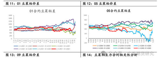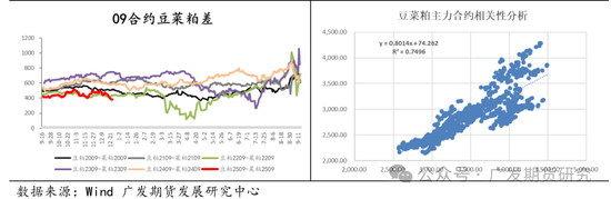 豆粕与菜粕的相关性较强,根据线性回归测算,其相关性约在75%左右。从合理价差的角度去讨论,当菜粕/豆粕比价在80%以下时,在水产料中添加菜粕具有价格优势,但一般75%~85%都是合理区间。豆菜粕之间波动区间近年来不断放大,伴随中美、中加贸易关系复杂化、俄乌局势变化、及国内进口通关政策等多重影响,价差从-150到1300都曾尝试过,其上限主要取决于豆粕出现强势多头行情,而其下限也多来自于豆粕的弱势,很难因为菜粕的单方面强势带来价差的大幅波动。供需关系复杂化,市场交易也更趋于情绪化,加剧了价差的波动空间。
