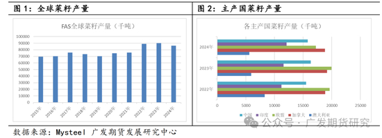 USDA旗下的海外农业局(FAS)数据显示,2024/25年度预计全球油菜籽产量为8744万吨,其中加拿大作为全球最大的主产国产量为2000万吨,占到全球产量的23%;排名第二的欧盟预计产量达到1745万吨,占全球产量的20%。中国和印度排名第三第四,产量分别为1580万吨和1210万吨,另外澳大利亚产量预计将达到550万吨、乌克兰为360万吨、俄罗斯为500万吨。上述7个国家的产量占到全球产量的90%。