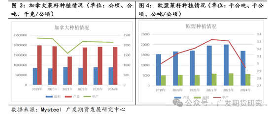 从单产来看,中国和加拿大水平相近,约在2.1~2.2吨/公顷,而欧盟菜籽单产能达到接近3吨/公顷。从2024年度产情来看,欧盟在4、5月份经历了寒潮,而加拿大也在种植末期经历了干旱,USDA预计欧盟产量同比下滑14.28%,加拿大同比下滑1.1%,全球产量预计同比下滑2.11%,整体影响相对有限,但局部地区如欧盟影响较大。