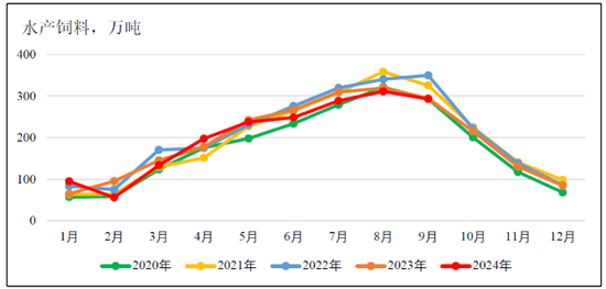在整个下游养殖中,生猪的影响力始终是最大的。因为从肉禽的养殖利润来看,波动频率很快,一年之内就可以波动多个来回,因为其生长周期短,所以产能的调整要比生猪快得多。因此肉禽饲料需求的年度波动相对有限。水产养殖的季节性非常显著,同比的变化也不太大。