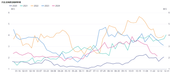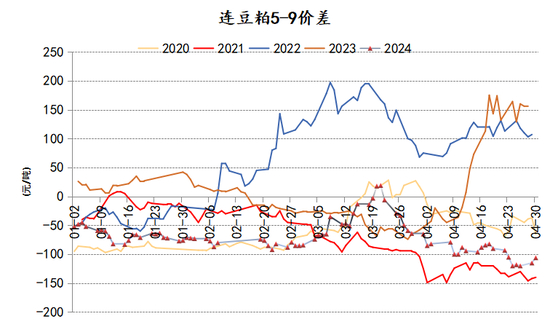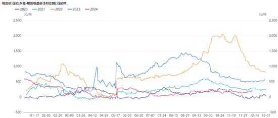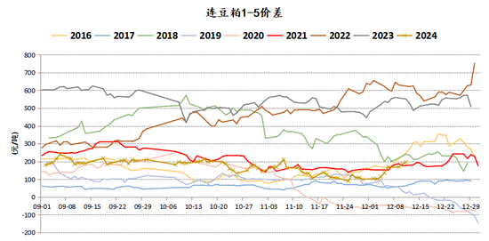 现货的上涨幅度不如期货,基差并没有太好的表现,实际上整个2024年基差都处于一个低位运行的态势,无论期货是涨是跌,现货跟随的意愿都不太强烈。但有一点可以肯定的是,现货基差如果长期处于低位的话,下游会一直保持低库存的策略,如果未来遇到某个比较大的刺激因素,基差也会和盘面单边一样出现“盘久必有行情”的局面。2022年、2023年豆粕跨月价差都出现过比较极端的情况,主要源于海关进口管控趋严,这种情况在今年依然存在,但是没有掀起什么波澜。同样一种题材,其效果往往是“一鼓作气再而衰三而竭”,或者是“再一再二不再三”。不过对于农产品来说,天气题材始终是永恒的主题。2024年大部分时间对于北美、南美大豆生长来说,天气都是比较顺利的。供应端没有题材,需求端也没有亮点,豆粕也就没有太大的行情,沦为了今年大火的油脂尤其是棕榈油的陪衬。