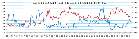 图表:美豆库销比月度统计与主力合约收盘价对比