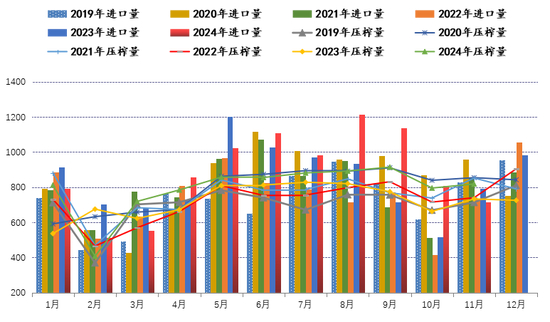 图表:国内大豆月度进口量及压榨量