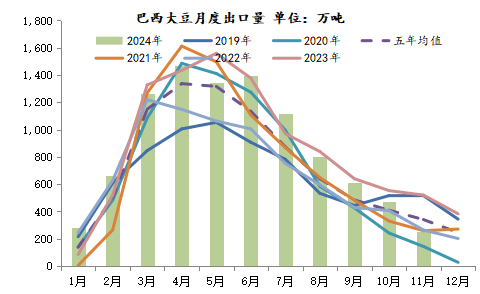 二、南美大豆—产量预估过早,变数较大,勿过分乐观2024年1-11月巴西大豆出口量为9679万吨,同比降1.5%。9月以来巴西大豆出口降速较为明显,体现出减产的影响。(22/23年度为1.62亿吨,23/24年度为1.53亿吨)目前USDA对巴西24/25年度大豆产量的预估是1.69亿吨,同比增1600万吨,阿根廷24/25年度大豆产量预估为5200万吨,同比增380万吨。正常来说,四季度由于美国大豆开始大量上市,巴西大豆贴水处于季节性回落的走势,今年在巴西大豆关键生长期之前贴水提前大幅下跌,反映出弱拉尼娜预期下,市场对于巴西大豆丰产,全球供需宽松的预期较为一致,另外最近宏观扰动较少,市场主要依据供需基本面进行交易。另外最近的雷亚尔汇率隐隐有突破盘整区间上行的趋势,也比较有利于巴西农户售粮。巴西贴水的提前走弱为远期炒作产量不及预期提供了空间。目前接近1.7亿吨的产量处在一个很高的水平,天气有一点风吹草动就容易出现预期差。图表:巴西大豆月度出口量