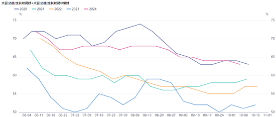 24/25年度美豆单产5月第一次公布的时候是52蒲式耳/英亩,跟去年一致。我们发现近些年以来,5月份美农公布的美豆初始单产逐年提高。若播种进度正常的话,8月之前一般不会调整单产,若8月之前美豆主产区风调雨顺的话,8月单产一般会上调,反之则视情况而定是否下调,报告发布时间10号左右,针对的时间是7月底之前的作物状况,8月上旬若出现极端天气是暂不考虑在内的。今年的单产调整节奏跟去年23/24年度是存在明显区别的,8月报告由于前三个月的风调雨顺而大幅上调单产至53.2,随后9、10月份报告单产维持在高位,11月开始修正。翻回头来看,今年美豆生长优良率跟20/21年度类似,但多数时候并不如20/21年度,当时初始单产给的不高,只有49.8蒲式耳/英亩,8月报告单产跳增到了53.3,但可能由于单月上调幅度过大,随后就开始逐月修正,最终单产停留在51。今年的情况是8月份的单月上调幅度不算很大,11月才开始修正。 我们可以得出这样一个结论,由于8月单产并不是实测单产,也没有进入到关键生长期,所以误差比较大,后面大豆逐渐进入成熟期、收获期,8月份以后的天气状况对单产预期的影响更大。 截至到目前,全美大豆平均单产还是难以突破52这样一个关键瓶颈。近5年单产的峰值21/22年度的51.7,其所对应的当年的优良率走势也并不是十分理想,今年的情况整体好于当年,当年是在8月下调单产,随后又逐月上调单产。优良率数据在每年的10月中旬停止公布,6月初开始公布。 优良率可以作为反映美豆生长状况的指标,但其跟单产并没有很强的线性关系。我们可以找到一些美农调整单产数据的规律,但是找不到通过优良率来推测单产的规律。优良率可以作为短期天气炒作的辅助指标,对盘面波动的确会有影响,但这种影响是不完全理性的,所以一般都会出现反向回归的情况。