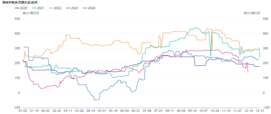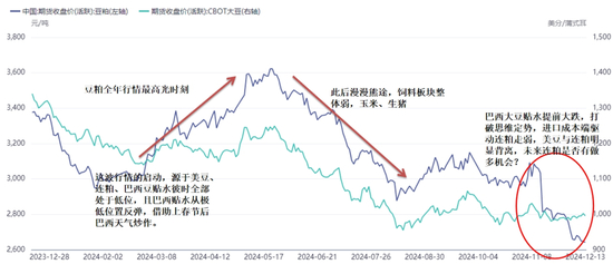 所以要具体回溯一下豆粕的年度走势。2月底豆粕主力合约跌至3000附近,而美豆主力跌至1150附近,此时巴西大豆贴水已经从一个同比较低的位置回升。 连豆粕主力价格、美豆主力价格,巴西大豆贴水当时都处在一个偏低的位置,而国内养殖下游也普遍保持低库存。这时如果能有一个导火索的话,那么行情将很容易被引爆。 这个导火索果然来了,巴西大豆生长后期南部主产区强降雨引发减产预期,尽管后期市场对于减产幅度有所证伪(只减少了200-300万吨的产量),但并不影响行情的演变。南美产量炒作的情绪传导到国内叠加国内下游的低库存,导致下游备货情绪迅速攀升,量价齐升。但实际上美豆这3个月的走势是比较理性和克制的,美豆从1150美分涨到1250美分,其间也经历了长时间的震荡,其上行趋势远没有连豆粕那么理想。也就是说美豆的筑底为豆粕的上涨形成了先决条件,但有了这个先决条件,不意味着行情一定能上涨。安全边际有了,没有关键驱动的话也是无源之水无本之木。5月下旬-8月中旬,美豆从1250美分跌至955美分,而此时的连粕主力从3600跌至3000附近,并没有进一步的深跌。连粕涨了600点,又跌了600点,各自差不多都用了3个月的时间。而8月中旬-11月中旬这3个月的时间,美豆和连粕都在底部震荡运行。 注意,此时包括笔者在内,市场就容易形成一种思维定势或者误判。也就是认为既然美豆跌不动了,那么连粕可能也下不去,未来依然是上涨预期。再来分析此时的那3个关键点(美豆价格、连粕价格、巴西大豆升贴水),美豆价格和连粕价格处在相对低位,而巴西大豆出口升贴水并没有。 今年巴西大豆升贴水从2月底到10月底,处在一个平稳抬升的过程中,这也是相对比较符合过往的季节性走势的,10月底之后巴西大豆升贴水开始转弱了,当然此时也没有继续走强的理由,因为美国大豆要批量上市了,今年美国大豆产量虽然也经历了“预期差”,但总体上看跟巴西一样是丰产格局。12月以来巴西豆贴水的加速下跌从进口大豆成本端的角度施压连豆粕,在暂时没有宏观、地缘政治因素干扰的当下,主力机构依据基本面去做空完全说得过去。但是当下巴西豆贴水又跌至近5年同期的偏低水平了,继续下跌的空间有多大这就不好说了。