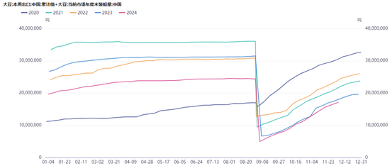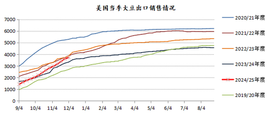 截至12月5日,美国累计出口销售2024/25年度大豆3728万吨,去年同期为3337万吨。其中销售至我国的量跟去年同期比相差不大。