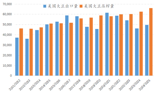 图表:美国大豆年度出口量与压榨量(单位:千吨)