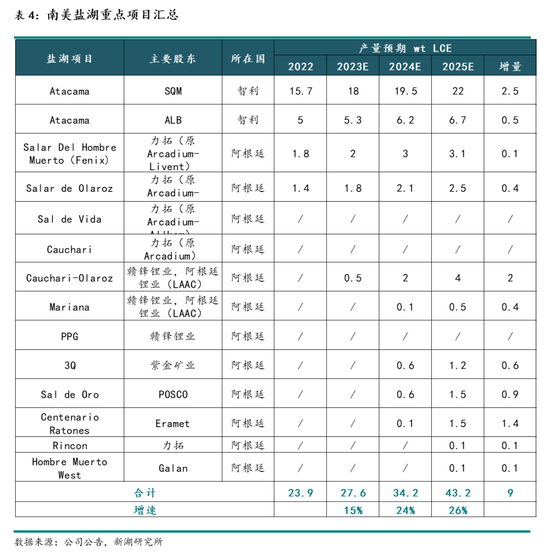 24年南美盐湖全年产量预期为34.2万吨 LCE,同比增长24%;25年全年产量预期为43.2万吨 LCE,同比增速加快(+26%),增量为9万吨 LCE,重要增量项目可关注SQM的Atacama以及Eramet的Centenario。