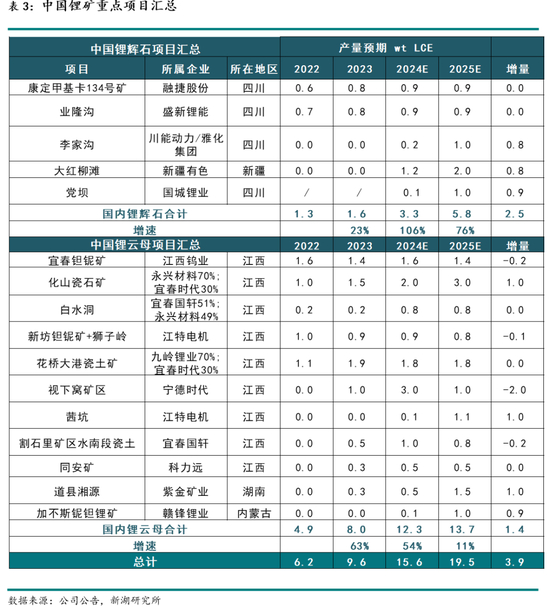 中国锂矿石(辉石+云母)24全年产量预期为15.6万吨 LCE,同比增速低于前期市场预期;25年全年产量预期为19.5万吨 LCE,增速将进一步放缓,增量3.9万吨 LCE。预计25年主要增量项目为大红柳滩、党坝、化山瓷石矿、茜坑等,主要减量项目为枧下窝项目。