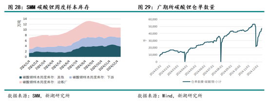 从库存情况来看, 24年碳酸锂库存结构转变,冶炼厂库存向下游及贸易商环节转移。全年总库存仍处于累积态势,根据SMM数据,截至12月19日,碳酸锂周度样本库存为10.82万吨,年内累库约62%,8月底起由于需求持续超预期,出现连续14周合计超2万吨的去库。 现阶段产业链库存水平仍较高,预计25年去库阻力仍较大。