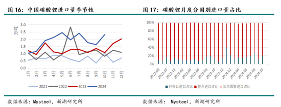 24年中国碳酸锂进口量高速增长,主要源于智利及阿根廷。根据海关数据,24年1-10月中国碳酸锂累计进口18.77万吨,同比增长54.6%,增速较去年显著提升。其中从智利进口14.82万吨,同比增加40.5%,占国内总进口量的80%,从阿根廷进口3.57万吨,同比增加147.4%。 预计25年随着阿根廷盐湖新产能扩建及爬产,进口量仍维持较高水平增长。