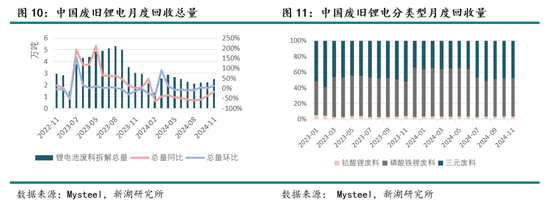 供应上,原料端来看, 24年资源端已出现一定扰动,但整体影响规模有限,预计25年供给增量主要来自于南美盐湖及非洲锂矿,供给减量情况根据锂价下跌幅度及时间长度存有较大弹性,预计主要减量项目为高成本澳非矿、低品位锂云母。回收料方面,预计25年回收料生产企业仍面临利润倒挂困境,产量供给将进一步下降,同时,随着行业监管与规范趋严,预计25年中小回收企业将逐渐出清,行业结构优化。 冶炼端来看, 预计25年碳酸锂产量将继续维持高位,增速出于24年的高基数效应或有所下降。