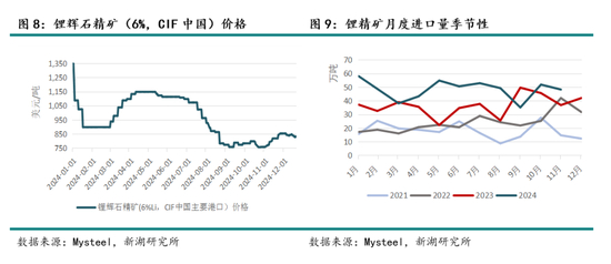 24年随着锂辉石精矿进口价格下降,外采锂辉石生产企业原料成本下降,整体处于盈亏平衡状态,外采锂云母生产企业由于长期利润倒挂大多均转为代加工模式,一体化生产企业仍有一定利润。根据钢联数据,24年我国碳酸锂总产量预估为68.87万吨,同比增长39.45%,从年内节奏上来看,自5月起放量开始加速,其中,锂辉石原料占比约49%,锂云母原料占比约22%,盐湖占比约17%,回收料占比约12%。 预计25年国内碳酸锂产量仍保持增长,增速或有所放缓,预计辉石料产碳酸锂量将继续走高,云母料产碳酸锂量或继续走低。国内闲置锂盐产能丰富,新产能投产周期短,锂价出现明显利润空间后产量上升弹性较大。