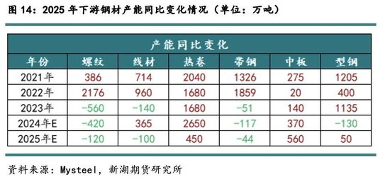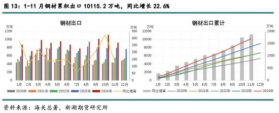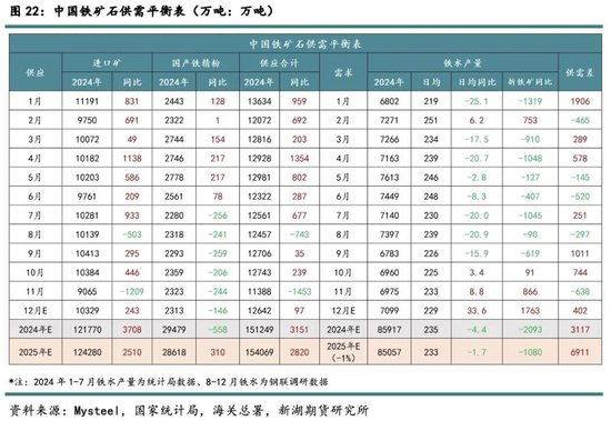 明年看来,国内地产需求仍然是用钢最大拖累项,预计同比下降15%;基建用钢需求在地方政府化债压力减轻和“两重项目”建设发力的预期下有望再度贡献4.5%的正增长;其他制造业方面,“两新项目”将继续推动新一轮大规模设备更新和消费品以旧换新,我们预期汽车、造船、机械、家电等行业合计贡献4%的用钢增量,从Mysteel统计的2025年钢材新增产能来看,与制造业直接相关的热卷产能虽然增速有所放缓、但同比仍然保持增长,中板则进入加速投产周期;出口方面,尽管特朗普上台后未来可预见贸易摩擦增多,但供应链及焦炭成本优势使得中国钢材仍将具有较高性价比,此外,随着“一带一路”相关海外项目在中东和非洲的加速建设,2025年建筑用钢出口有望带来同比增量,因此,明年出口或将维持高位。综合来看,我们预计2025年下游需求同比小幅下降0.8%,在不考虑政策影响的前提下,明年生铁产量降幅与下游需求相近,预计国内铁矿石需求同比下降约1%。