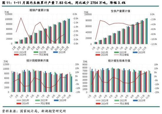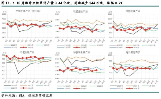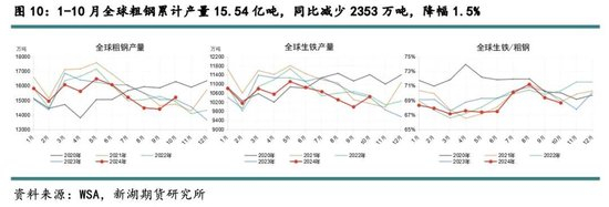 2024年全球钢铁需求仍在下行通道。1-10月全球粗钢累计产量15.54亿吨,同比减少2353万吨,降幅1.5%;全球生铁产量同样连续第三年下降,降幅较去年大幅走扩,1-10月全球生铁累计产量10.57亿吨,同比减少3001万吨,降幅2.8%。