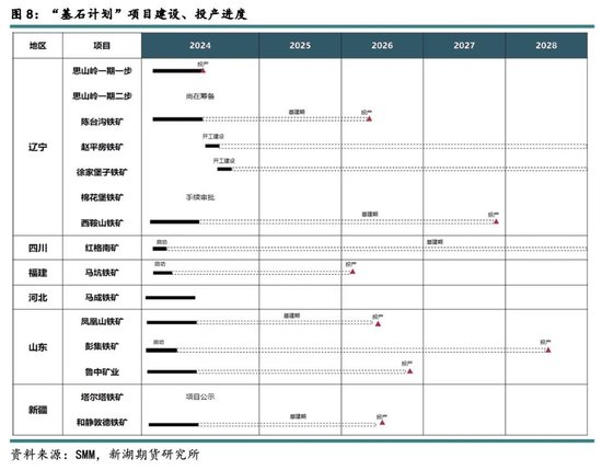 2022年初,“基石计划”提出到“十四五”期末实现国产精粉产量3.7亿吨,而2024年预计全国铁精粉产量约为2.95亿吨,未来一年增产7500万吨(+25%)完成难度较大。从明年项目增量角度来看,SMM统计显示,2025年国产铁精粉增量以项目增产和复产为主,新项目投产多集中在2026年及以后。具体来看,辽宁思山岭铁矿、河北马城铁矿、四川白草和秀水河以及山西代县矿山复产合计或将带来310万吨同比增量。