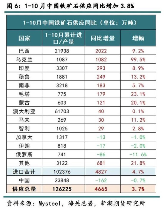 数据显示,2024年1-10月中国铁矿石供应同比增加约4665万吨。具体来看,进口矿增量主要来自巴西和乌克兰,巴西矿1-10月进口量累计同比增加2022万吨,占总体增量的43%,绝大部分由Vale贡献、其同期累计发运增量高达1818万吨;乌克兰1-10月累计进口增量达1082万吨,占总体增量的23%,主要是去年同期战争影响导致基数极低;印度矿进口虽然同比仍然贡献正增长,但增量受到跌价、印度内需增长及极端天气等因素影响,远低于去年预期。