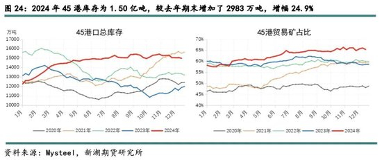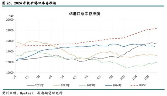明年来看,行业产能过剩大背景下,钢厂仍将采取低库存策略控制资金占用比例,预计厂库延续偏低走势。港口库存方面,下游需求或有结构性亮点、但总量增长缺乏驱动,供应端在当前已然过剩的情况下还有Onslow等低成本矿冲击,港口继续累库确定性较高,下半年随着供应放量还将面临加速累库风险,预计2025年45港库存年底达1.83亿吨,同比增加3400万吨。