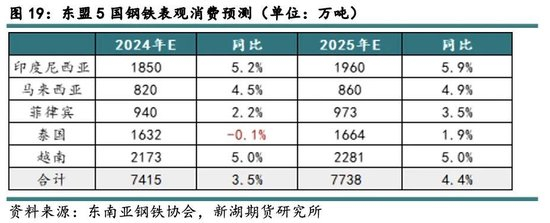 东南亚方面,当地钢协预计2024年地区钢材需求将达到7650万吨,同比增长3.7%。其中,东盟5国印尼、马来西亚、菲律宾、泰国和越南2025年的钢铁需求分别有望实现5.9%、4.9%、3.5%、1.9%和5,0%的增长。东南亚钢协预计东盟主要国家的钢材表观消费量2022-2026年年均复合增长率可达3.65%,印度尼西亚和菲律宾是主要增量来源。产能方面,东南亚钢铁协会预计到2030年,区域钢铁总产能将扩大至1.648亿吨,新增产能8430万吨,其中中国企业的投资建厂是新增产能的主要驱动力。