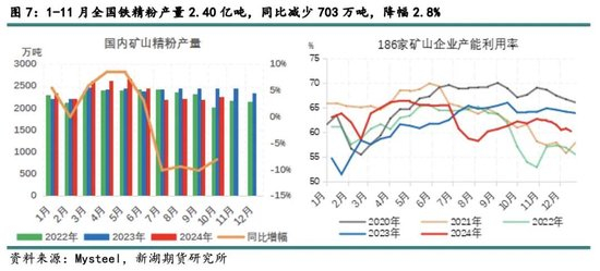 国内矿方面,1-11月322家矿山企业铁精粉产量2.40亿吨,同比减少703万吨,降幅2.8%,上半年内矿产量恢复超预期,7月开始受河北地区安全检察等因素影响、产量回落,后续环保、事故、检修等问题接连导致复产不顺,产量同比产生缺口。