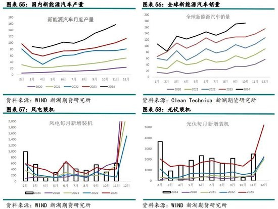 虽然24年国内电源投资下滑带来的光伏及风电增速明显下降,但其仍是铜消费的重要驱动力,是24年国内铜消费韧性较强的主要原因。1-11月风电新增装机同比增长25%至51.75GW,光伏装机同比增长25.9%至206.3GW。在出口高增长,国内以旧换新政策加持,以及车企降价促销等作用下,24年国内新能源汽车产量增速反而较23年扩大,1-11月新能源汽车产量累计增长37.5%至1148.9万辆,新能源汽车渗透率进一步提升至41%。1-10月全球新能源汽车亦实现了25%的增速,累计销售了1346万辆。