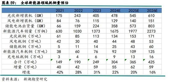 在经过前几年高速增长之后,2024年全球光伏、风电装机以及新能源汽车增速明显下滑,但目前全球新能源领域基数已显著提高,即便增速下滑,对铜消费的拉动量仍在50万吨以上。2024-2026年按照风电装机年均复合5.3%,光伏装机年均复合8.1%,新能源汽车年均复合10.7%的增速来算,25、26年全球新能源端对消费的贡献量在60万吨附近。