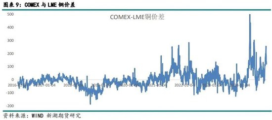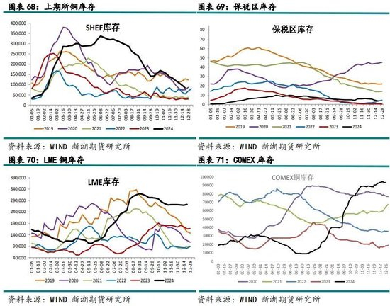 24年因80美金的高长单TC,以及60%以上的高长单比例支撑,以及冷料供应充足,国内炼厂产量超预期。而消费端受新能源增速下滑以及国内地产投资大幅下滑,铜消费增速下滑。因此国内铜供需偏过剩。而且2024年全年海内外库存走势完全背离。上半年在国内持续累库海外则呈现去库,炼厂在出口利润的驱动下,从3月份开始积极布局出口,并在5月份COMEX逼仓后,6月份出口超15万吨。因此国内的过剩量输出至国外,LME从6月开始,COMEX则从8月开始持续累库。整体看,2024年全球库存合计累库24万吨,其中上期所累库4.2万吨,保税区累1.6万吨,LME则累10.5万吨,COMEX累库7.5万吨。