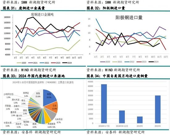 2024年4月国内开始执行“反向开票”政策,市场对带票废铜需求攀升, 2024年带票的进口废铜大幅增长,1-11月累计进口162.4万吨,同比增加13.7%,增幅19.5万吨。但在特朗普胜选后,11月下旬开始,国内废铜贸易商暂停从美国进口废铜,因担忧特朗普关税影响。2018年针对特朗普对国内商品加征关税,国内采取对应的反制措施,其中就包括对来自美国的铜废碎料进口加征25%关税。从进口数据也可以看到,2018年加征关税前后,国内自美国进口的废铜量大幅下滑。2020年3月该反制措施取消后,我国自美国废铜进口量恢复至正常水平,2024年平均每月自美国进口废铜3万金属吨,约占废铜总进口量的20%。在特朗普关税政策明朗前,预计国内自美国的废铜进口量都将维持低位。这将造成再生铜进口的减少。对于炼厂来说,冷料紧缺的局面至少在明年一季度前难以缓解。