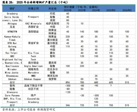 2025年全球矿山增量仍主要由紫金矿业和洛阳钼业贡献。除此之外,力拓预计25年其蒙古资产预计将增长50%,到2030年有望实现100万吨的目标。据表28统计,2025年全球矿山新增项目的投产、扩产将带来约60万吨的增量,较24年小幅下滑;26年增量则继续下降50余万吨。