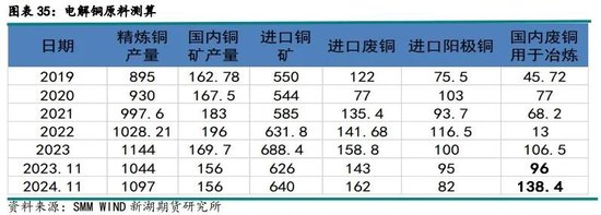 据SMM数据,1-11月国内精铜产量同比增加53万吨。可以说冷料供应超预期,是2024年炼厂产量未大幅下滑的重要原因。在当下铜价处于低位,国内废铜持货商惜售,再生铜进口下降,25年下游加工对废铜需求增加,以及25年海外粗铜依然紧缺的背景下。2025年预计冷料供应将较2024年明显下降,从而制约国内炼厂产量的释放。2025年或许只能寄希望于铜价大幅拉涨来提振国内废铜供应的释放。