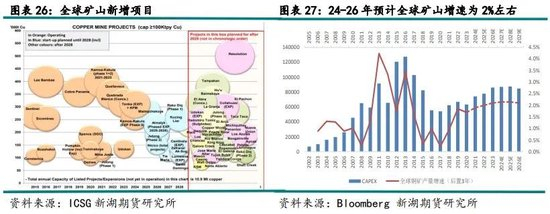 疫情之后全球矿山的成本明显攀升,且在高位运行。根据Woodmac的统计2024年全球铜矿C3成本90%分位数为7700 美元/吨,2019年该值为6600美元/吨,上升了16.7%。因此近几年全球矿企的资本开支相较于前一轮高峰差距较大。一般来说资本开支投入3年后将兑现至产量的增长上。受制于近几年的低资本开支,预计24-26年全球矿山的复合增速降至2%附近,此前一轮高资本开支带来全球矿山2012-2016的年均复合增速则在3%以上。