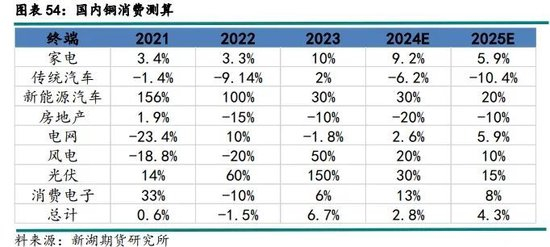 根据上述分析,预计2025年国内消费将达到4.3%。其中地产投资收窄至-10%,家电和电网均为铜消费带来约6%的增速。