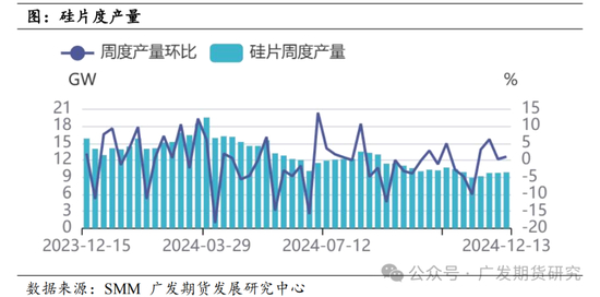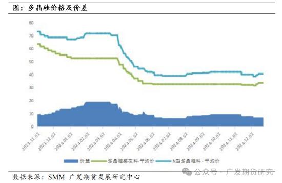 2024年多晶硅产业链面临产能释放,叠加下游需求增速不及产量增速,从而价格持续下跌,二季度跌至几乎全行业亏损,随后持续低位震荡。具体来看,随着多晶硅的产能释放,产量增长,价格也持续走跌,除春节前补库上涨外,其余时间均承压下跌。据SMM,2024年,N型多晶硅料价格从年初的67元/千克跌至12月10日的38.5元/千克,跌幅高达43%。菜花料价格从年初的53.5元/千克跌至12月10日的31.5元/千克,跌幅高达41%。N型多晶硅料的价格跌幅较大主因前期N型料需求较好因此价格有一定溢价,后续随着N型料生产比例的提升,价格下跌幅度较大。