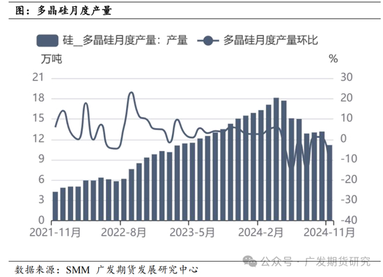 随着多晶硅产能持续释放,2024年多晶硅产量持续创新高,直到5月大量企业检修减产后产量有所回落。上半年在青海丽豪、合盛、南玻、大全和通威的产能释放以及去年产能爬坡的背景下,多晶硅产量持续创新高。据SMM数据统计,2024年1-4月国内多晶硅产量为67.41万吨,同比增长58%。5月多晶硅价格跌破4万元/吨,全行业面临亏损,检修减产企业增加。二季度开始检修减产的企业持续增加,四季度进入枯水期,西南地区产量进一步大幅下降。5月-11月国内多晶硅月产量从17.7万吨下降至11.16万吨。即便下半年多晶硅产量明显下降,但受益于上半年的高产量,1-11月多晶硅累计产量达165.4万吨,同比增长22.6%。随着行业自律在光伏业协会的推进下在12月达成,预计未来月均产量将降至约10万吨/月左右。
