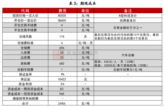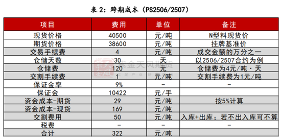 期现价差、月间价差需考虑期间持有成本。期现价差方面,按挂牌基准价计算,PS2506-现货的价差预计为2486元/吨,则PS2506价格预计在41086元/吨,高于当前N型现货价格。月间价差方面,按挂牌基准价计算,PS2506/2507合约理论价差为322元/吨。(具体见表2、表3)