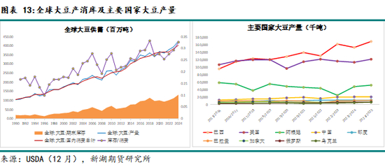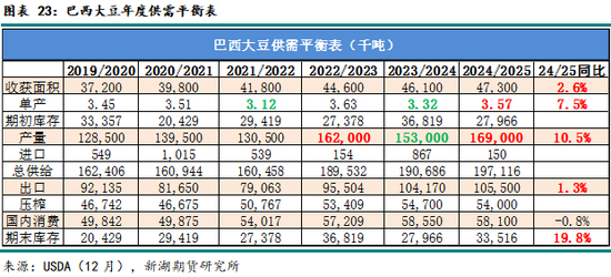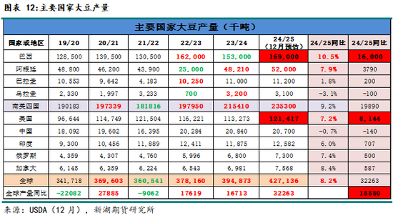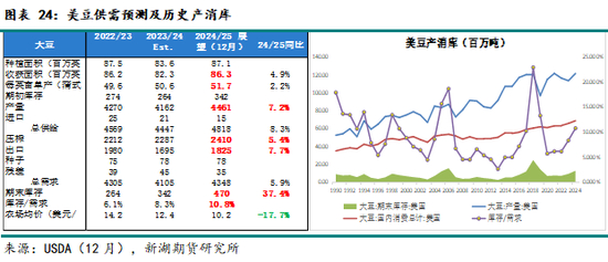 24/25年度全球大豆供需压力异常沉重。USDA12月预估显示,本年度全球大豆产量同比预计增加3200万吨。其中,美豆同比增加810万吨。若未来一个月降雨良好,巴西大豆本季产量同比或增1600万吨,增幅近10%。